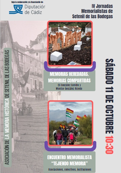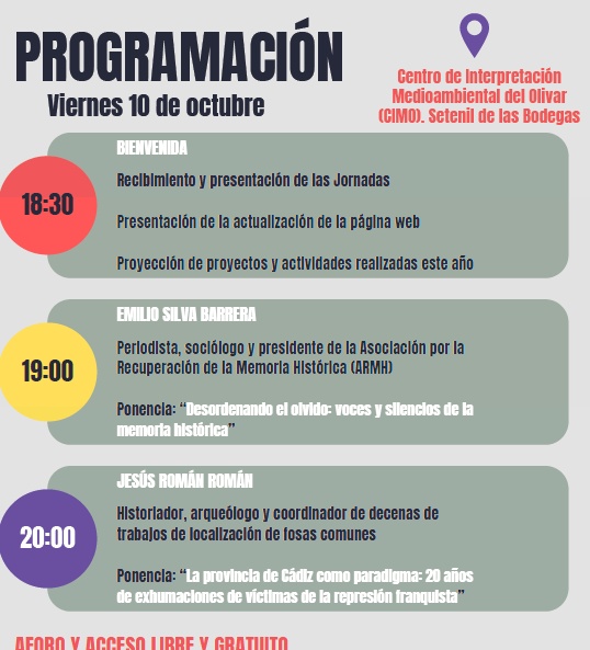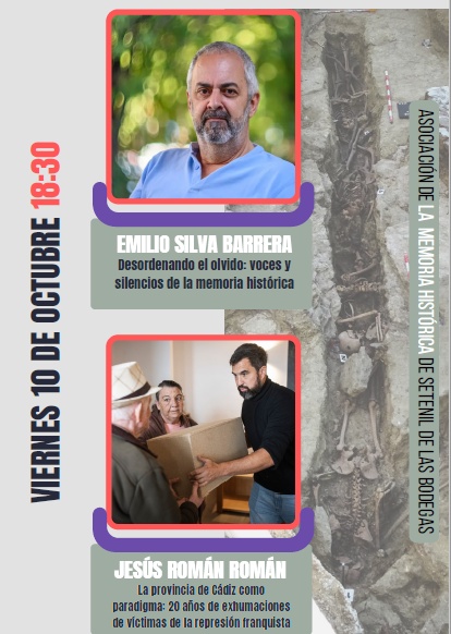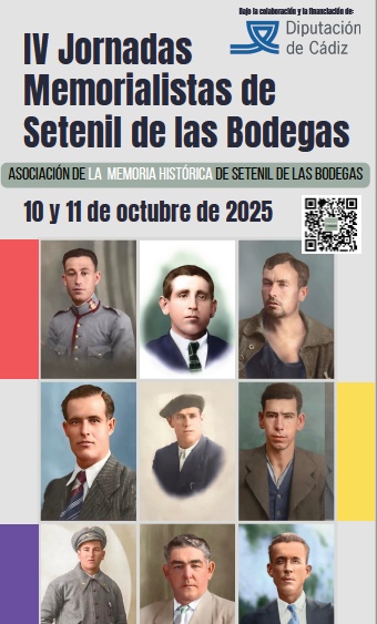 La Asociación de la Memoria Histórica de Setenil de las Bodegas ha organizado las IV Jornadas Memorialistas, que se celebran los días 10 y 11 de octubre de 2025. El viernes dñia 10, tiene lugar en el Centro de Interpretación Medioambiental del Olivar, a partir de las 18:30 horas, está previsto el rRecibimiento y la presentación de las Jornadas, además de la presentación de la actualización de la página web y la proyección de proyectos y actividades realizadas este año por parte de la entidad convocante. A las 19 horas, Emilio Silva Barrera, periodista, sociólogo y presidente de la Asociación por la Recuperación de la Memoria Histórica (ARMH), presenta su ponencia “Desordenando el olvido: voces y silencios de la memoria histórica”. Seguidamente, Jesús Román Román, historiador, arqueólogo y coordinador de decenas de trabajos de localización de fosas comunes, presenta su ponencia “La provincia de Cádiz como paradigma: 20 años de exhumaciones de víctimas de la represión franquista”.