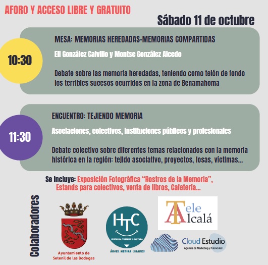 El sábado día 11, a las 10:30 horas, Eli González Calvillo y Montse González Alcedo participan en un debate sobre las memoria heredadas, teniendo como telón de fondo «los terribles sucesos ocurridos en la zona de Benamahoma».