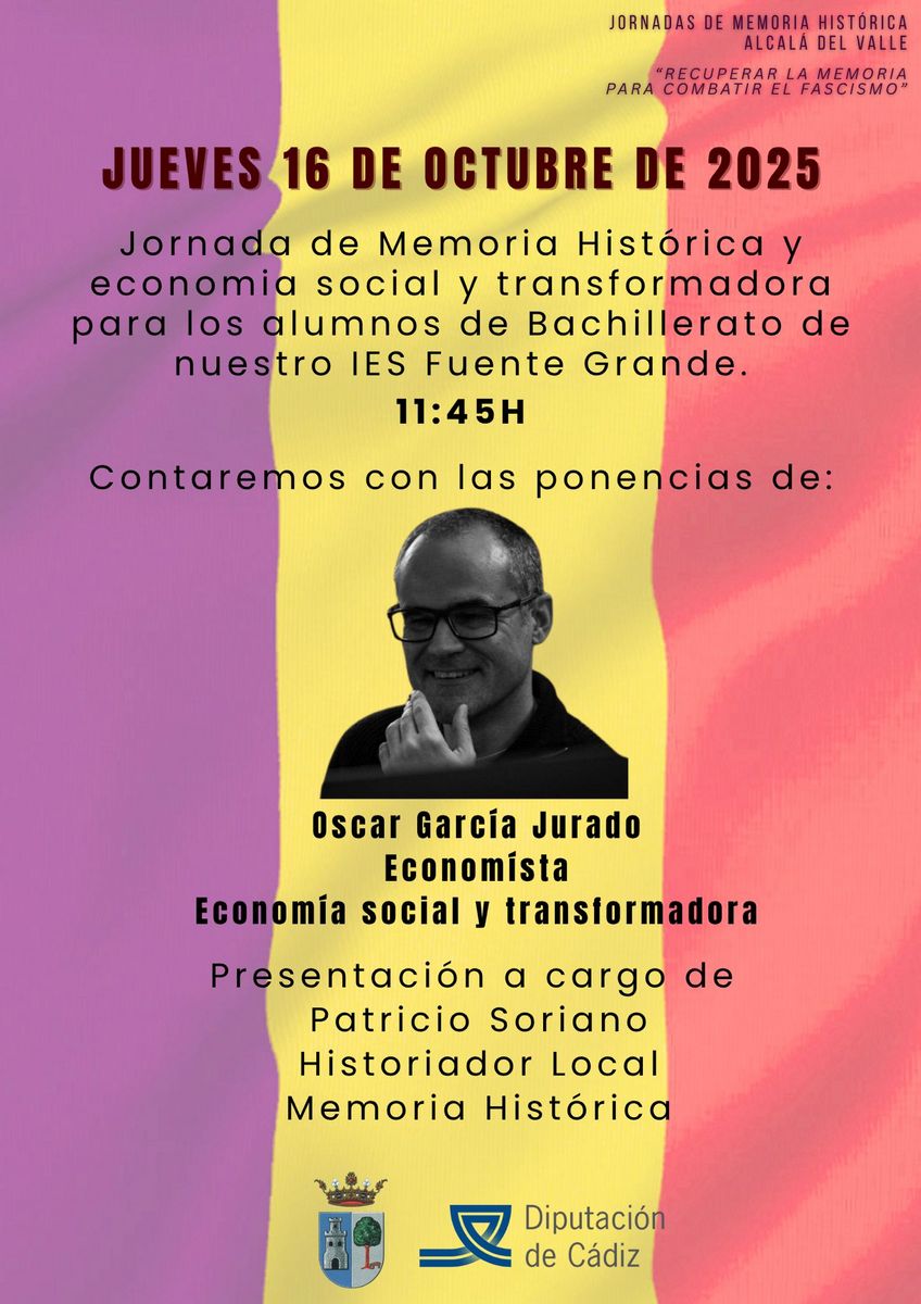 • Jueves 16 de octubre de 2025, 11:45 horas, IES Fuente Grande: Jornada de memoria histórica y economía social y transformadora para alumnos para alumnos de bachillerato. Conferencia a cargo de Óscar García Jurado, economista. Presenta: Patricio Soriano, historiador local.