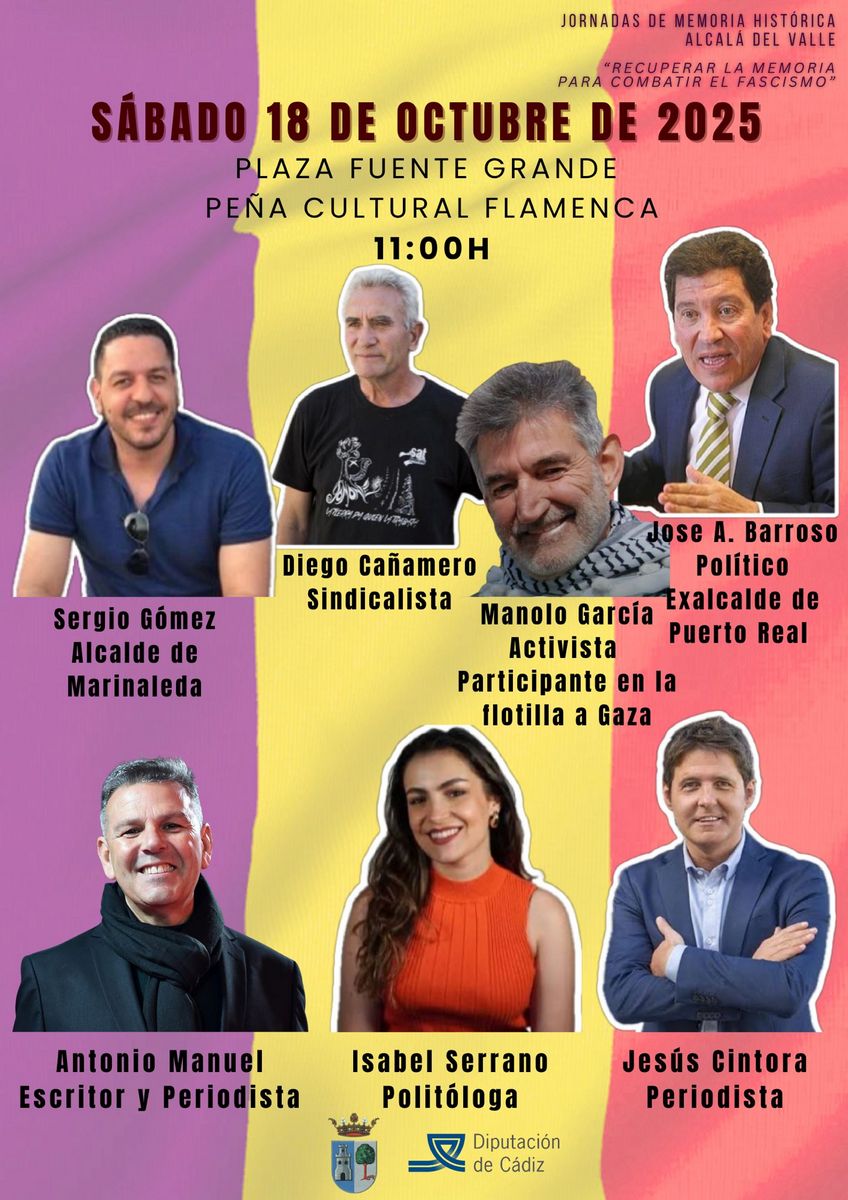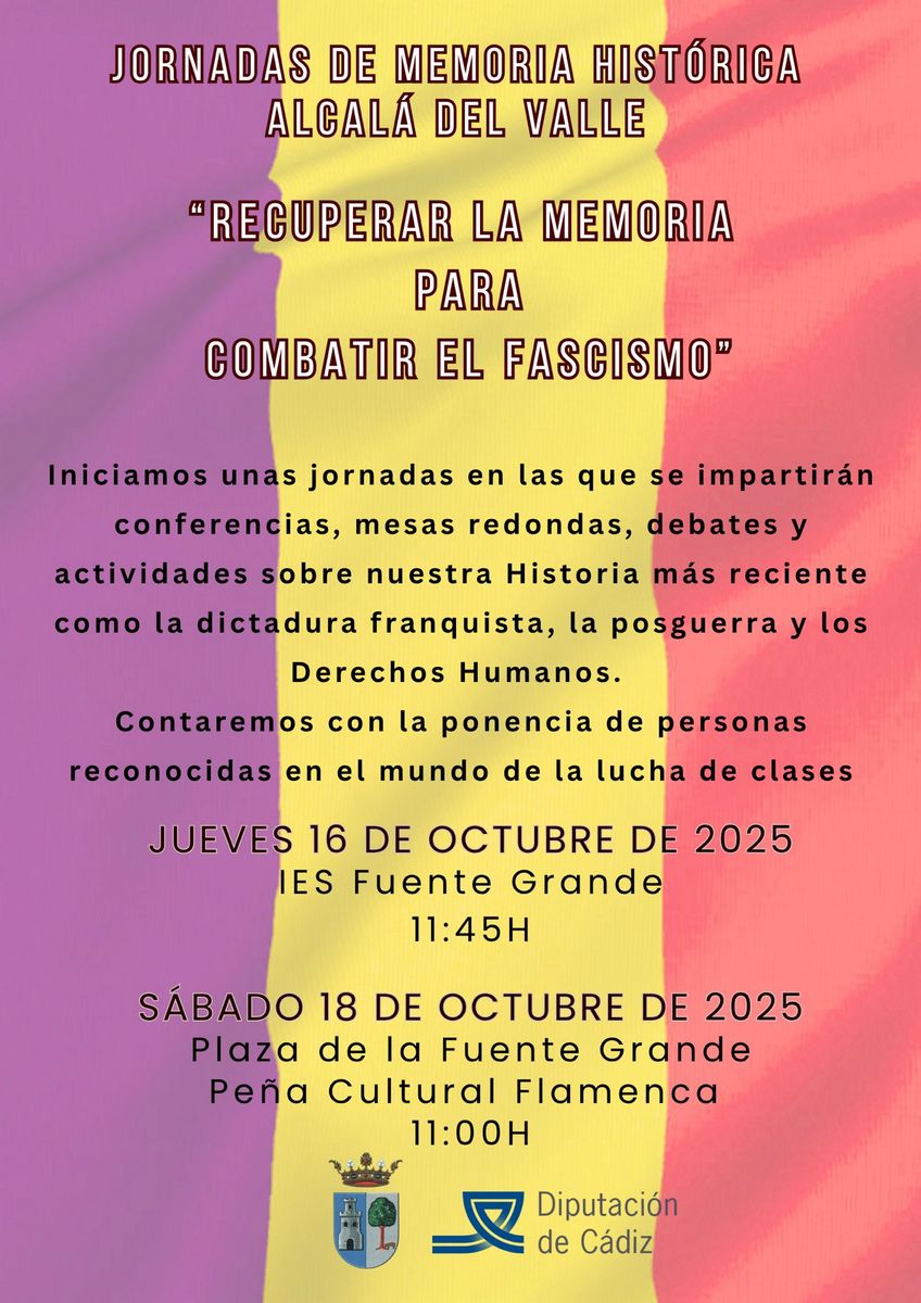 El Ayuntamiento de Alcalá del Valle, con la colaboración de la Diputación de Cádiz, ha organizado unas Jornadas de Memoria Histórica con el título de «Recuperar la memoria para combatir el fascismo». La programación incluye conferencias, mesas redondas, debates, actividades sobre la posguerra, la dictadura franquista y los derechos humanos.