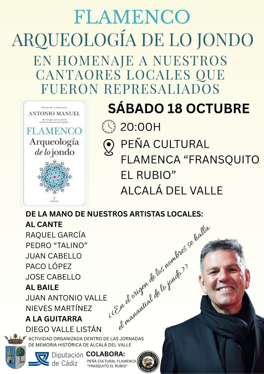 • 18:00 horas, Peña Cultural Flamenca «Frasquito el Rubio». Flamenco: «Arqueología de lo jondo». Homenaje a los cantaores locales que fueron represaliados. Participa: Antonio Manuel. Intervienen al cante Raquel García, Pedro Talino, Juan Cabello, Paco López y José Cabello; al baile Juan Antonio Valle y Nieves Martínez; a la guitarra Diego Valle Listán.