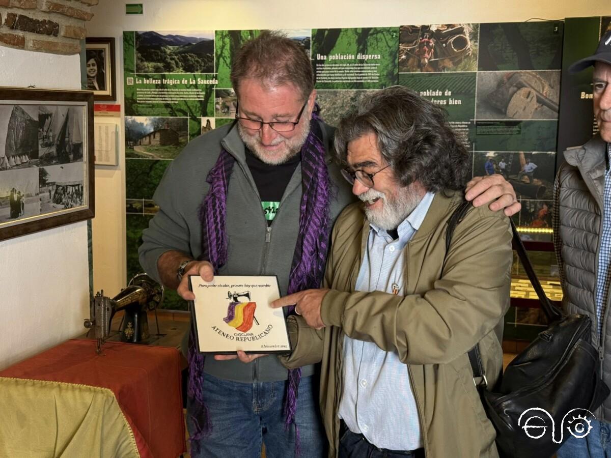 Recibidos por Andrés Rebolledo, las compañeras y compañeros obsequiaron a la Casa un bello azulejo con el emblema del ateneo, una máquina de coser pespuntando una bandera republicana, bajo el lema «Para poder olvidar, primero hay que recordar». Todo un detalle que nos ha emocionado pues precisamente, y en armoniosa sincronía, son siete las máquinas de coser las que habitan en nuestras instalaciones. Símbolos de la represión franquista ejercida sobre la mujer, pero también y sobre todo iconos de la resistencia y lucha de ellas para afrontar las adversidades.